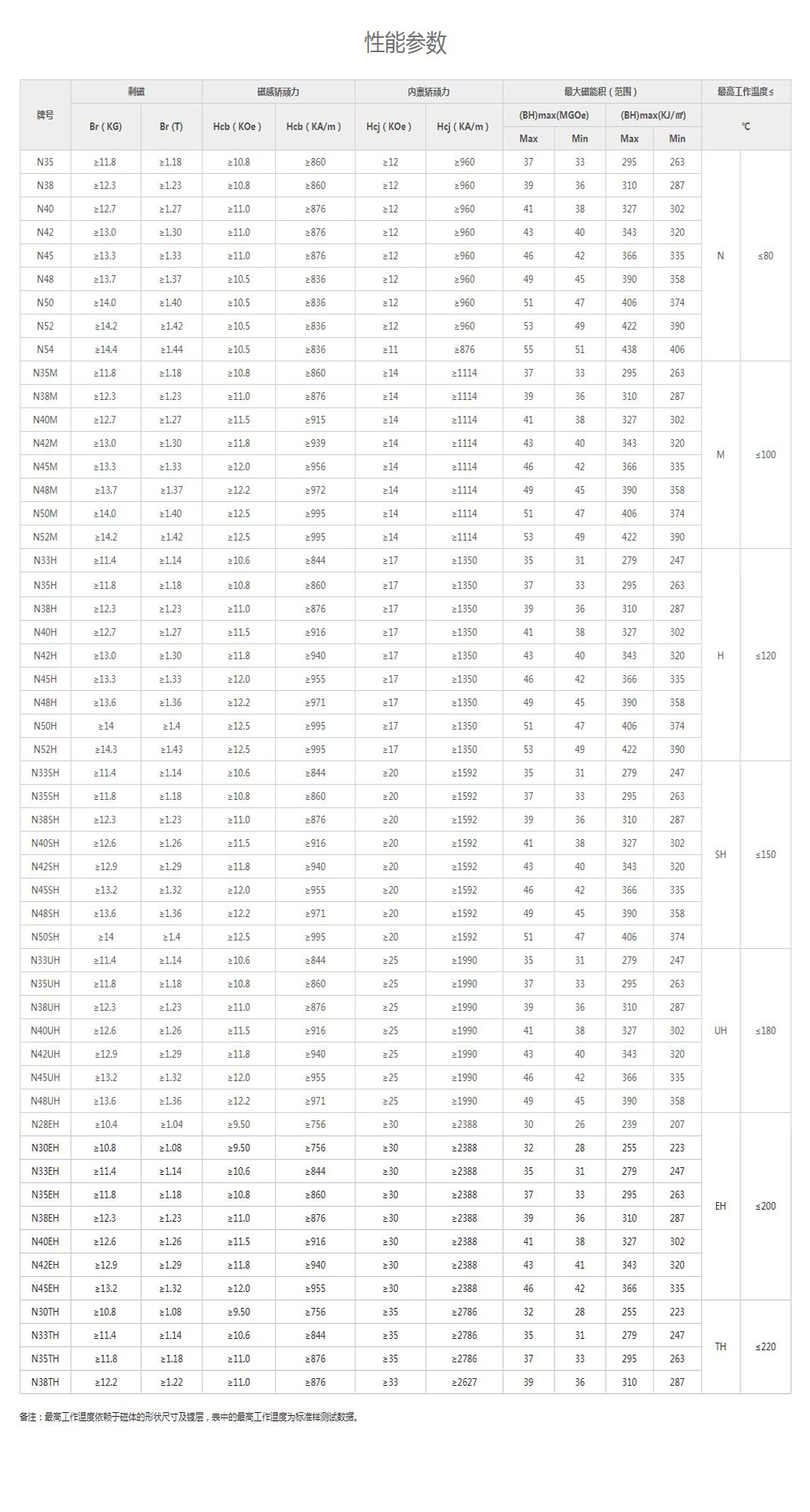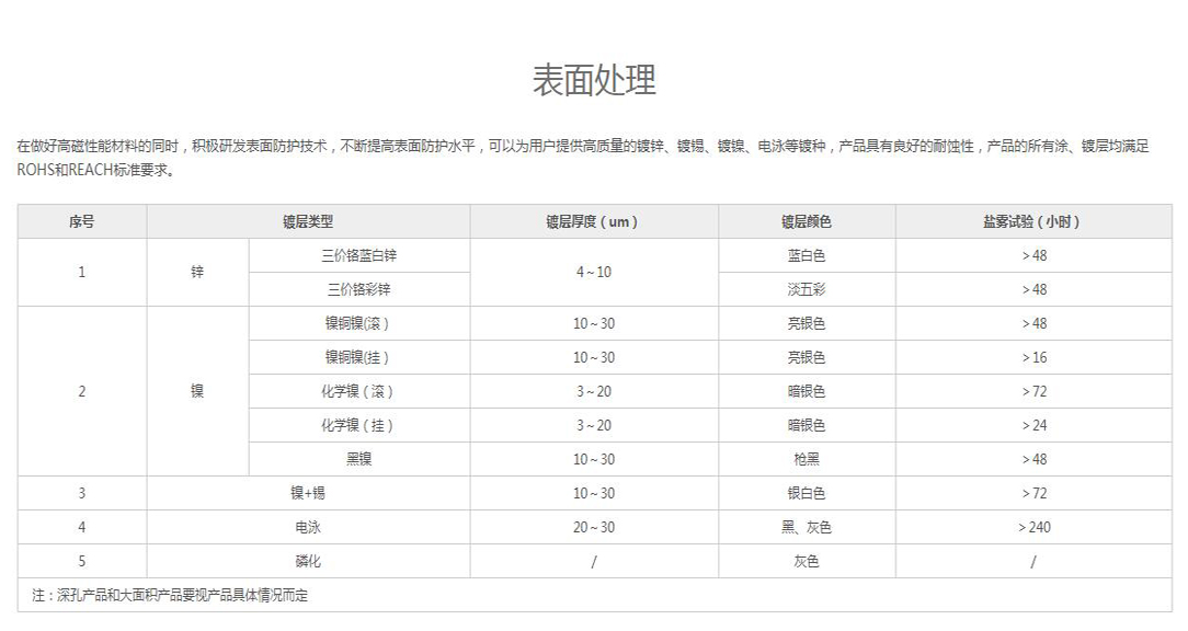 為了避免腐蝕的損害,使用時(shí)需要在永磁材料表面做保護處理,例如用金、鎳、鋅、錫進(jìn)行電鍍,以及表面噴涂環(huán)氧樹(shù)脂等。 釹鐵硼分為燒結釹鐵硼和粘結釹鐵硼兩種,粘結釹鐵硼各個(gè)方向都有磁性,耐腐蝕;而燒結釹鐵硼因易腐蝕,表面需鍍層,一般有鍍鋅、鎳、環(huán)保鋅、環(huán)保鎳、鎳銅鎳、環(huán)保鎳銅鎳等。而燒結釹鐵硼一般分軸向充磁與徑向充磁,根據所需要的工作面來(lái)定。
